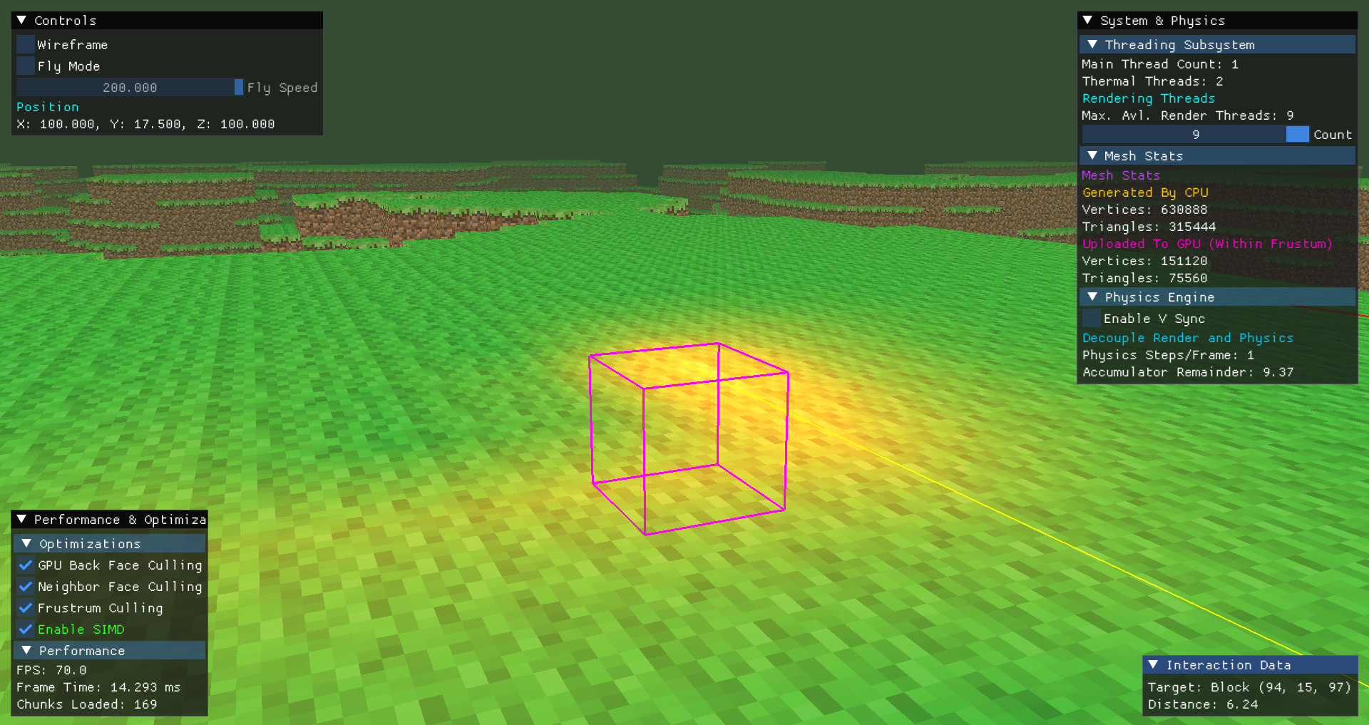 - Data-Oriented Design: Struct-of-Arrays (SoA) layout for voxel data to maximize CPU cache hits.