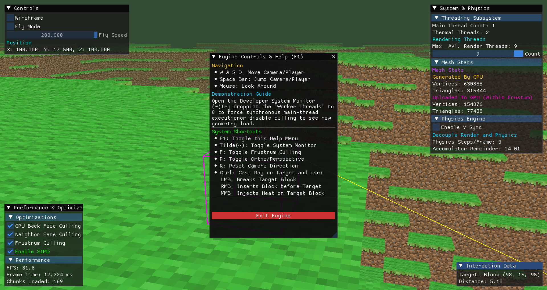 A high-performance CPU/GPU voxel engine built from scratch in C++20. Designed as a foundational framework for Computational Engineering (CAE) simulations, focusing on cache coherency, hardware-accelerated rendering, custom memory allocators, and low-level memory management.